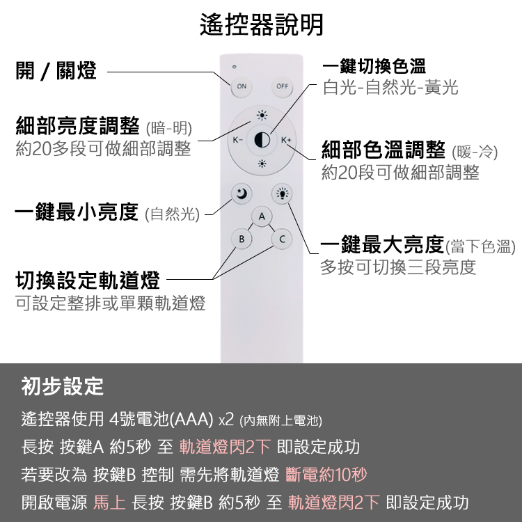 長按按鍵A約5秒至軌道燈閃2下即設定完成